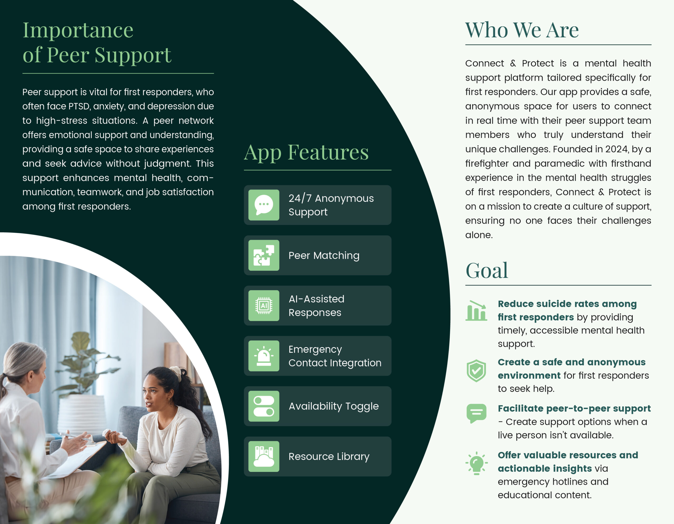Connect & Protect is a mental health support platform tailored specifically for first responders. Built on the values of connection and compassion, the app provides a safe, anonymous space for users to connect in real time with peer support team members who truly understand their unique challenges. Whether navigating stress, substance abuse, or feelings of isolation, first responders can find immediate support and tailored resources to foster resilience and well-being. Founded in 2024, by a firefighter and paramedic with firsthand experience in the mental health struggles of first responders, Connect & Protect is on a mission to create a culture of support, ensuring no one faces their challenges alone.